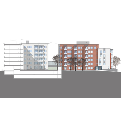 Re-use of former factory area as new housing. The project consists of three apartment houses and underground parking facilities.