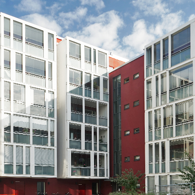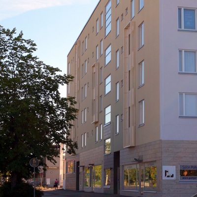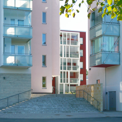 Katujulkisivuissa on vaaleat sävyt ja varioiva parvekesijoittelu, pihajulkisivuissa puolestaan voimakkaat sävyt ja systemaattinen parvekesijoittelu.