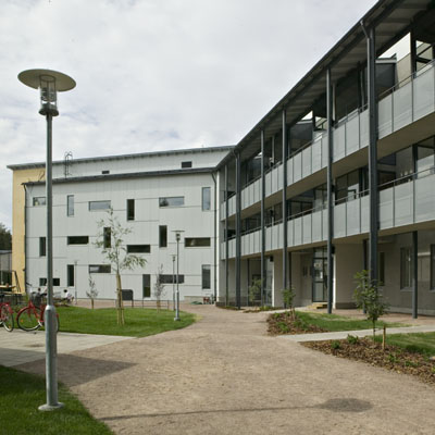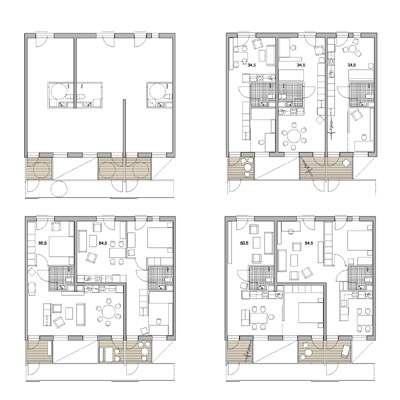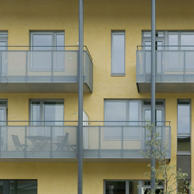 The location and orientation of the Klippinki buildings was the starting point for an adaptable building concept and an architecture based on Open Building. The access to most of the apartments is from semi-private open corridors bordering the sunny common yard. Each dwelling has living spaces on both sides of the building, one connected to the access corridor with a private glazed veranda, the other opening to the square with high windows and French balconies.